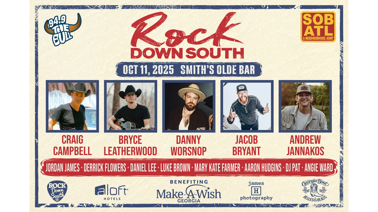 ROCK DOWN SOUTH feat. Craig Campbell, Bryce Leatherwood, Danny Worsnop, Jacob Bryant, Andrew Jannakos, Jordan James, Derrick Flowers Music, SOMOFO/Daniel Lee, Luke Brown & The Jubilee, Mary Kate Farmer, Aaron Hudgins and DJ Pat! Hosted by 94.9 The Bull's Angie Ward!
